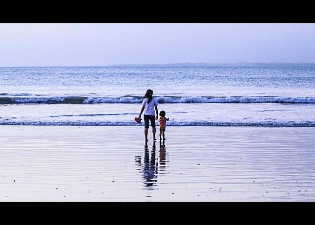 【大海边,母亲正和心爱的女儿,欣赏着这片纯净的美景】
