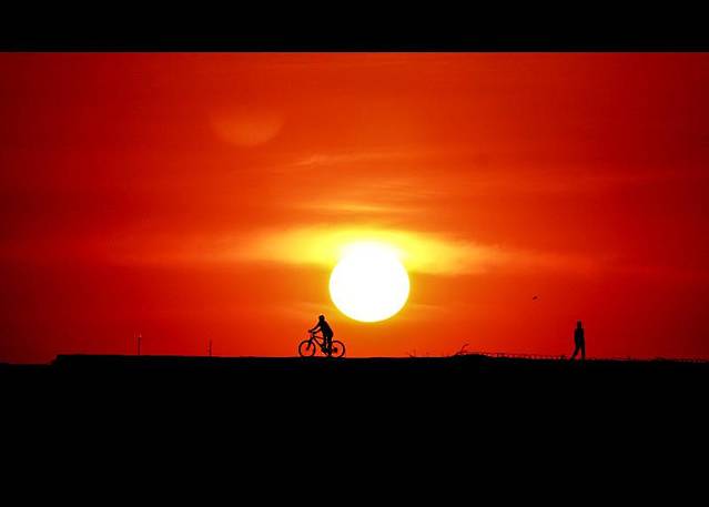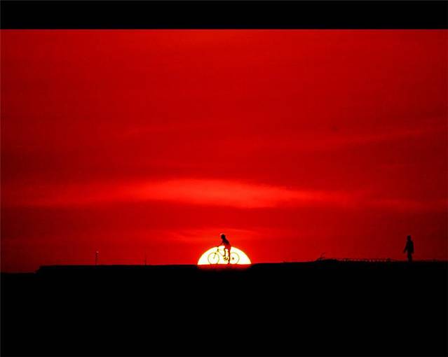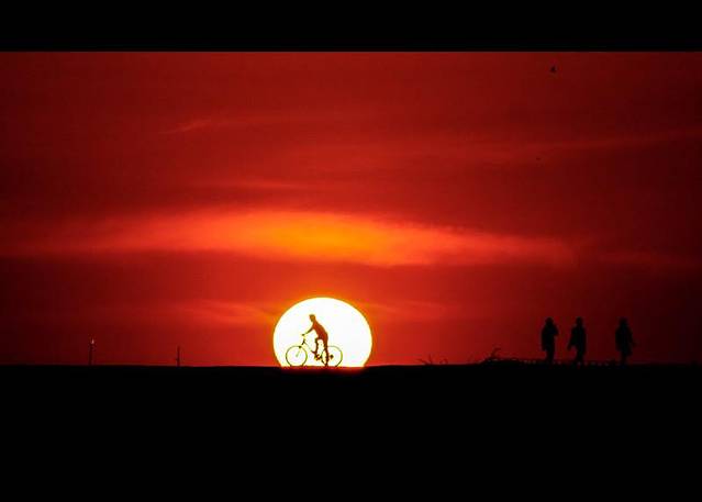【随着太阳缓缓落山,忙碌了一天的人们也该骑行归家】