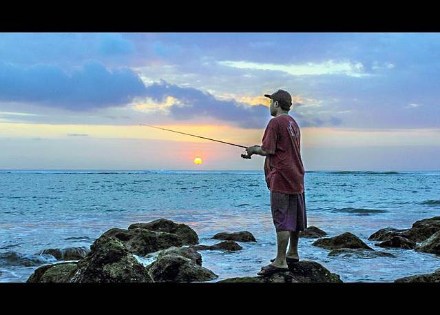 【海边的垂钓者,面对着平静的大海,享受着大自然的恩赐】