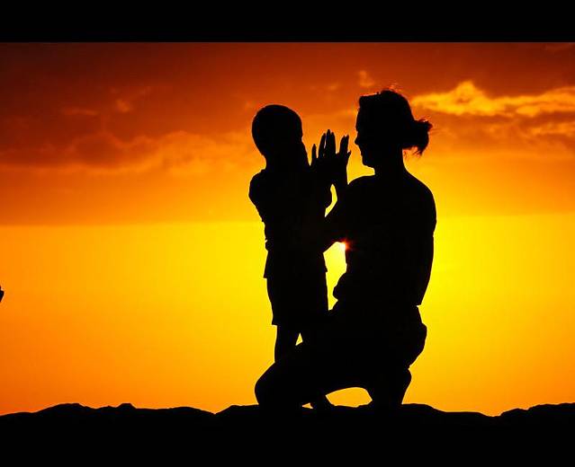 【夕阳下的母子,伴着落日的余晖,构成了爱意浓浓的画面】