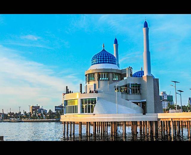 【美丽的水上清真寺,在晚霞的映衬之下更加耀眼】