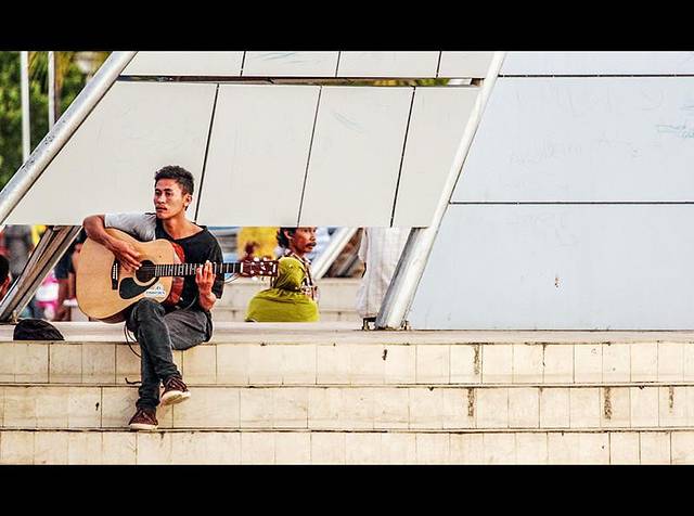 【广场前,年轻人随意弹着吉他】