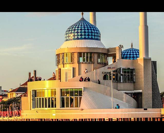 【余晖下的海上清真寺,显得宁静而祥和,给人以久违的感动】