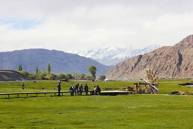 三五成群的塔吉克族男子在假期闲聊着,六一儿童节也许他们的孩子们都疯玩了