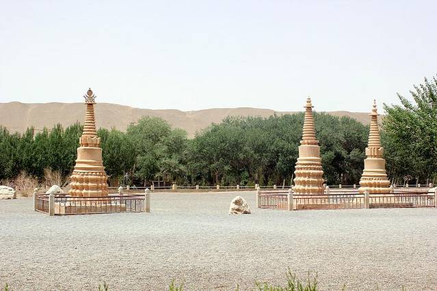 在敦煌除了一望无际的沙漠戈壁就是一片一片的希望绿洲,走出莫高窟景区远处的一些佛塔是一些古代高僧们的圆寂塔。