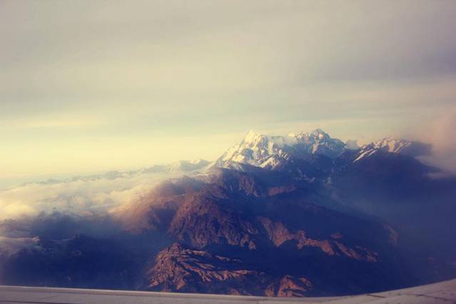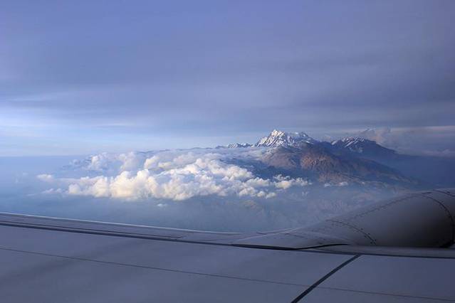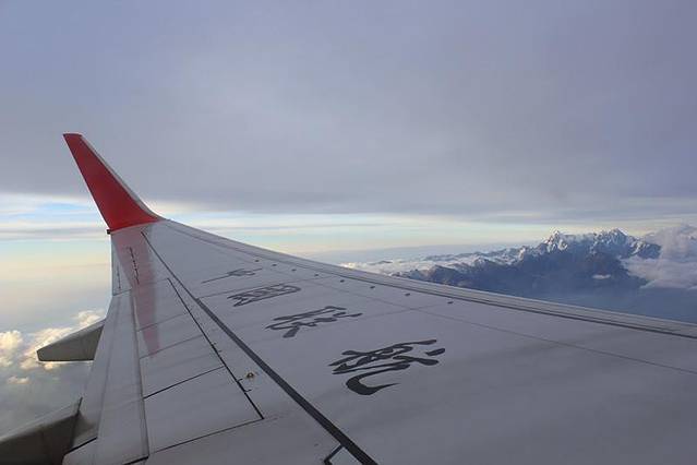 飞机从乌鲁木齐机场起飞后都要在空中拐一个大大弯,面朝东方飞去,飞机外的山脉是刚刚列入世界自然遗产的天山山脉,同时也是乌鲁木齐最高峰,山顶终年积雪。