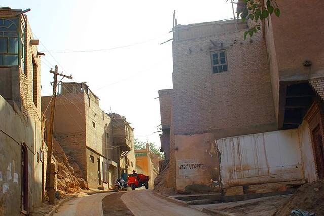 当天下午,我们就在喀什街头游荡。喀什的建筑风格显得很奇特,许多保存完好的土耳其式院落散落在现代化的建筑之中。以致于我们在小巷中闲逛,就仿佛到了“一千零一夜”的故事背景里。每条巷都有很多分叉,很深也很静,偶尔看到有开着门的院子内都挂着传统的丝绸。