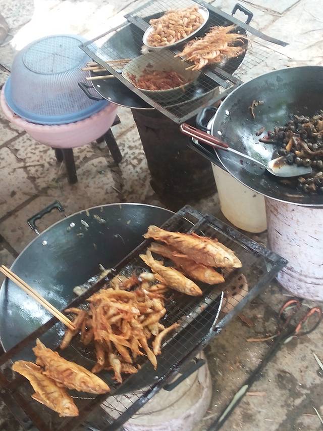 江岸旁边有美食一条街,都是吃饭的地方,还有许多像这样的小摊,金黄的炸鱼很吸引人