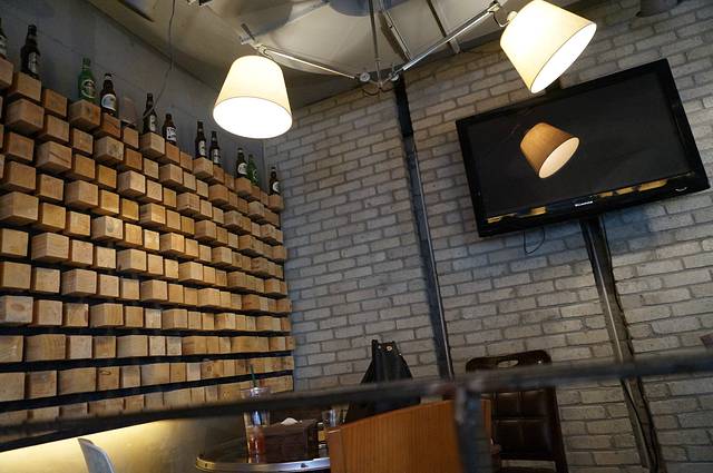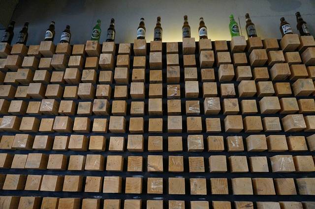 很有点意思的木方装饰墙,木方上面的啤酒瓶子,不知道是否大明星喝过的。
