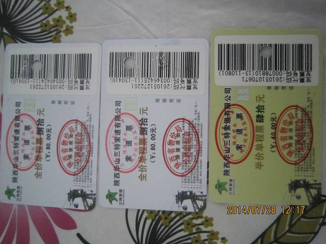 此次去华山我们是在火车站坐的游1,坐满即走,网上有攻略说是7点发车,其实不是那么准点的,是坐满即走,我们当天就是6点50分不到就发车了,车票价22,小孩免费。华山的门票是180元,小孩要买半票90元。在去华山的车上,有导游介绍,可以在车上就直接买成人票,但,小孩票买不了,必须去售票点买票。去售票点买票也很好买,而且可以刷信用卡,很方便。我们这次华山行是选的从北峰坐索道上山,再从北峰步行到西峰,再坐西峰坐索道下山,北峰索道票价80,小孩要买半票。西峰索道140,小孩70,中间坐车小孩都要买半票的。华山真的很险,有好多地方都是垂直的。这里要注意,北峰到西峰中间有好长一段是在没有树的山脊上走的,所以,最好带防晒霜、帽子、手套、水。一个人最好有3瓶水,然后再带点火腿等充饥的食品。山上的食品是出奇的贵,一碗方便面都20元。