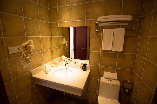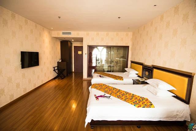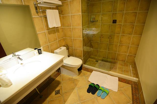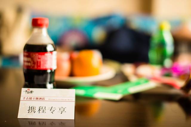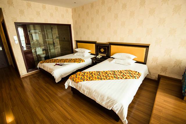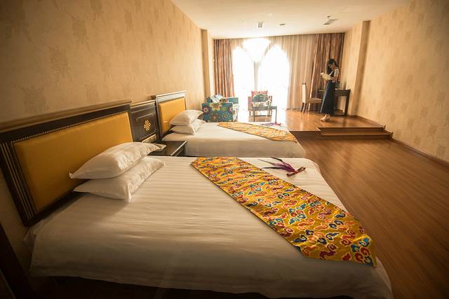我们的房间在四楼,电梯上去后走在毯子铺就的过道上很有感觉,也避免走动带来的噪音,很贴心。客房很是宽敞,设施也很完善,据说是去年才开张,所以总体让人有种焕然一新的感觉。客房内除了两张大床之外,专门还有一个类似小客厅的区域,上面摆放着两个沙发一个茶几,沙发都是带着浓厚藏族风格,茶几上摆放着两瓶饮料喝一盘水果,另外还放了两本介绍宋城的书籍可供客人阅读,值得一提的是,茶几上还整齐放着一张纸条上写:携程专享几个字,服务很到位。坐在这里你可以跟家人或者女朋友一起喝茶聊天,边上放着一张电脑桌,无线Wifi速度很快,地板是木质结构,整体给人的感觉还不错。