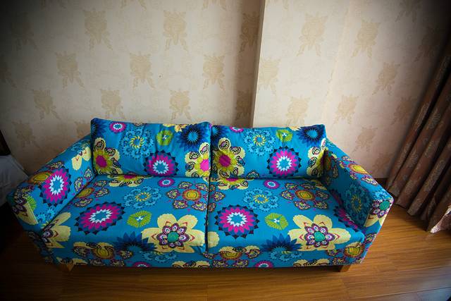 沙发区的一个带着浓厚藏族气息的双人沙发,坐上去相当舒适,我们就坐在这里玩Ipad,相当惬意。
