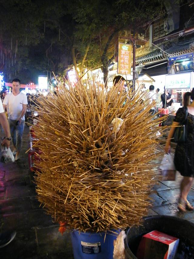 回民街的独有景色,大家吃完串串就这样把棍子插着。
