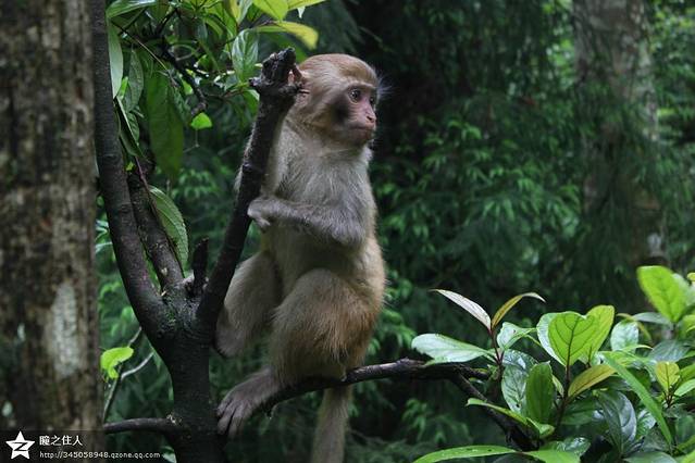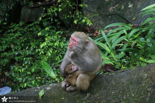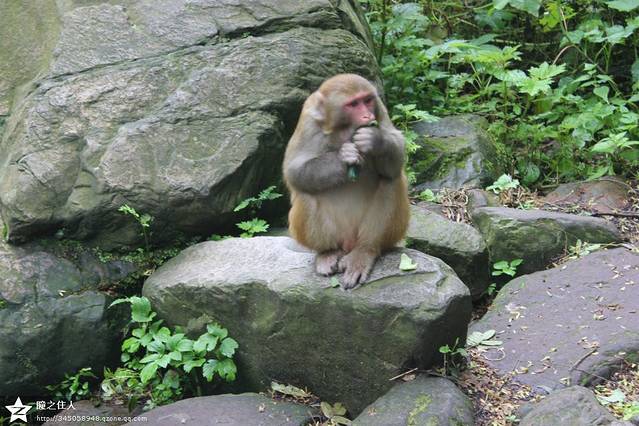 坐在石头上摆拍的猴家族。