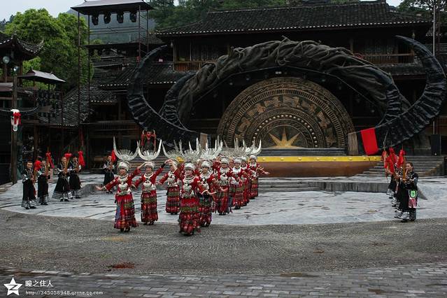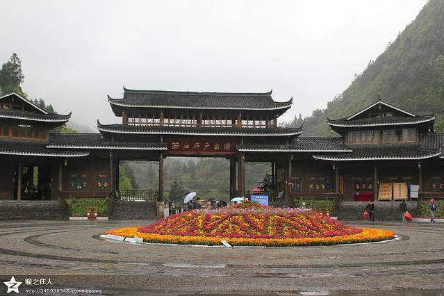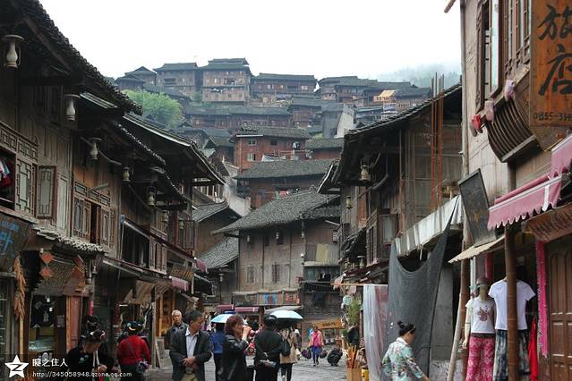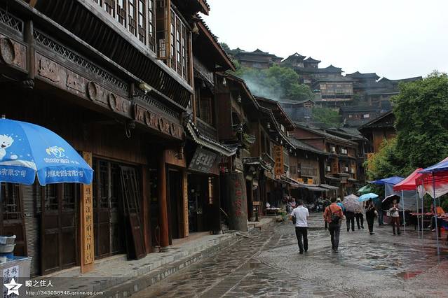 淅沥沥的下着小雨,每天两场的表演大概没有机会看了,完全是一大损失。坐了一段观光车,走一走整个苗寨最繁华的街道,苗寨保持着古老的建筑和传统的习俗,但也无法阻挡商业的入侵。