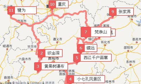 路线:犍为—贵州织金洞—黄果树瀑布—荔波小七孔—西江千户苗寨—镇远古镇—铜仁梵净山—凤凰古镇—张家界—重庆—犍为