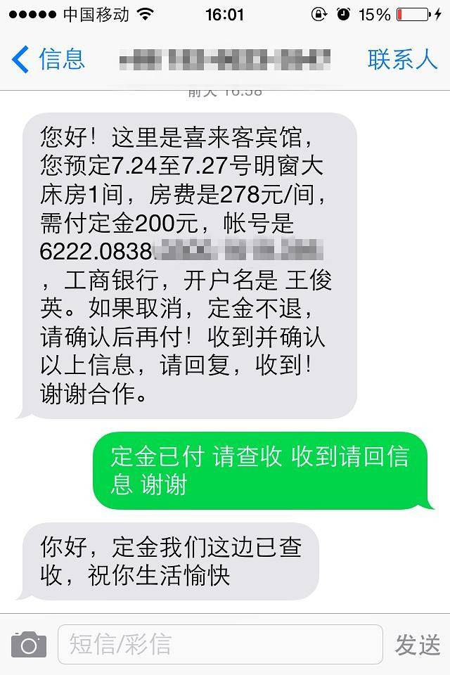 这家是之前姐们去当地玩住过的宾馆 其实和连锁酒店的‘如家’差不多 而且离景区很近 步行十分钟到栈桥 比较一下 如家当天的价位已经是500无上限了 所以很爽快的给老板付了200定金 (留好短信凭证)