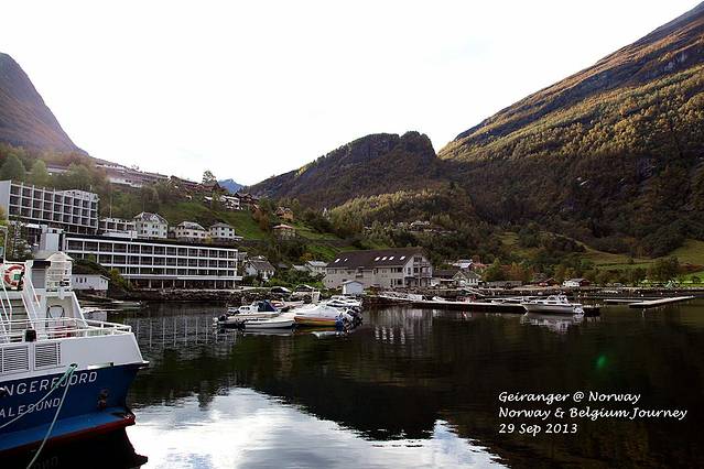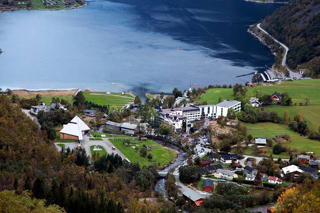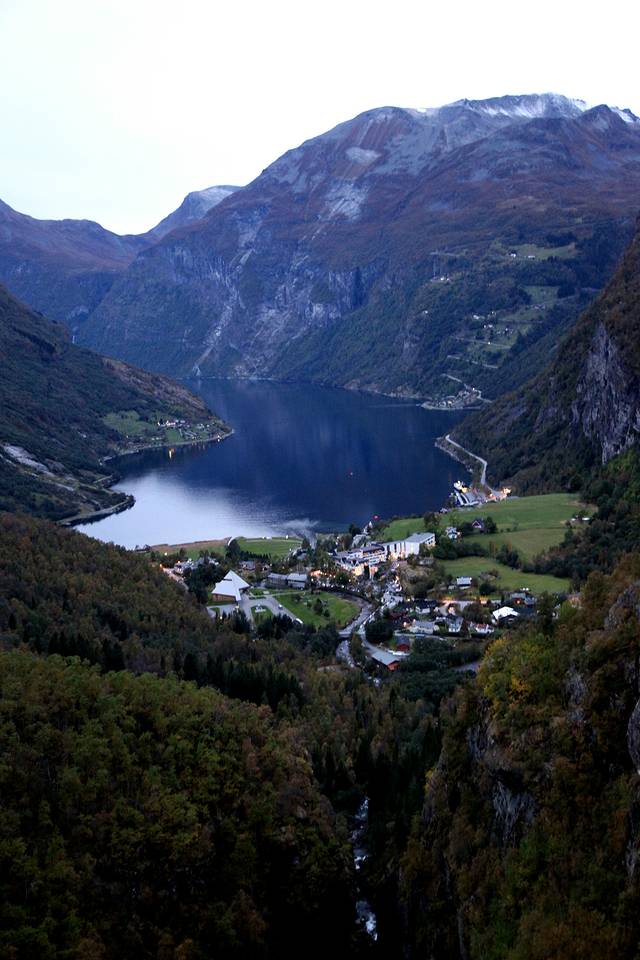 我们头一天晚上住在了峡湾末端的盖朗厄尔村,这个小村镇仅有250多人,却是峡湾旅游的不可或缺的水路、公路中转站。这里有茅草木屋、小巧的教堂、静谧的码头加上如镜的峡湾风貌,一切与静相关的元素组成了世外桃源般的景致。这里有19处宿营地,大部分位于半山腰,景观极佳。我们住的小木屋就位于山间,下面就是盖朗厄尔峡湾,对面是连绵起伏的群山。清晨推开窗,清新的空气扑面而来。一幢幢山间的小木屋,红的、白的、黄的,五颜六色,错落有致。