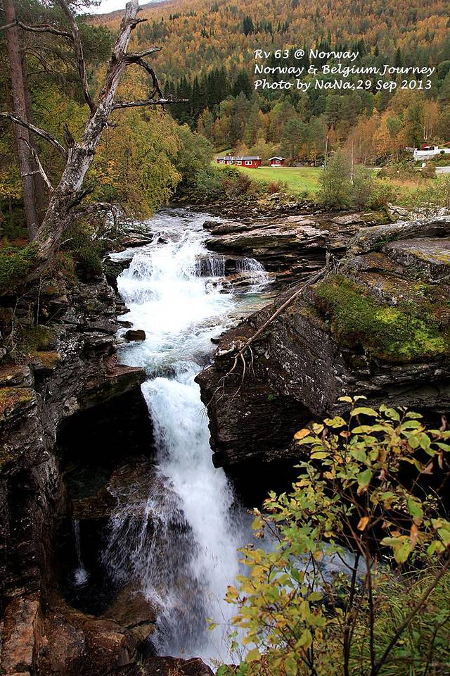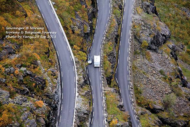托罗尔斯第根Trollstigen(妖精托罗尔的梯子)是精灵之路不容错过的观景台,在顶部有一个很大的露天停车场,有多处观景平台。它位于盖朗厄尔峡湾尽头,盘旋而上,风景异常雄伟,很多峡湾明信片的照片都在此取景。观景台周围3面都是笔直的岩壁,数条瀑布从岩壁的不同位置倾泻而下。我们到访的季节恰逢秋季,瀑布逐渐结冰,很是壮观。