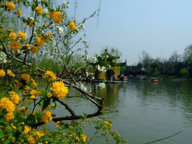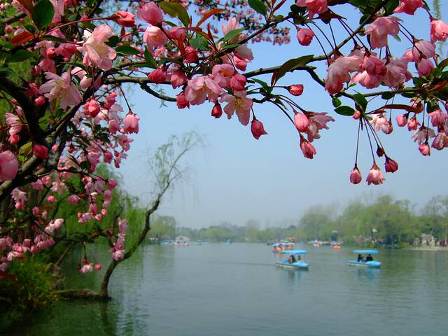 普通的垂丝海棠开在瘦西湖边,也变得多了几份秀气