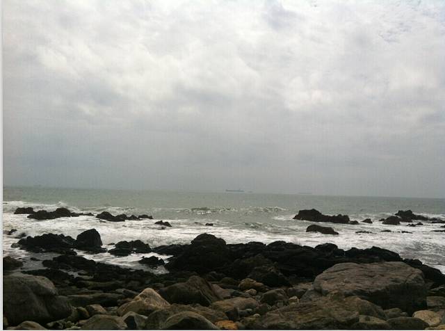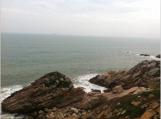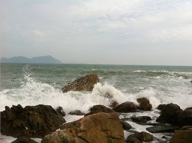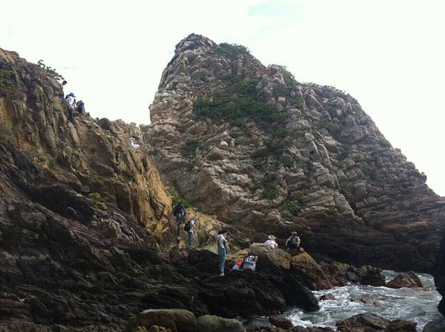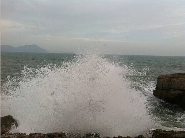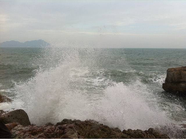 我们到达另一处观海点,大家都很兴奋的看着海水撞击着礁石泛起一次比一次高的浪花,一个队员站在离海更近的地方让我们拍照,可就在我准备起身时,一个大浪击中了我,顿时感觉全身都被浪花狠狠的打了一下,我就这样全身湿透了,连背包也都湿透了,可怜我的 iphone啊,还好没有掉海里,不然我可杯具了。
