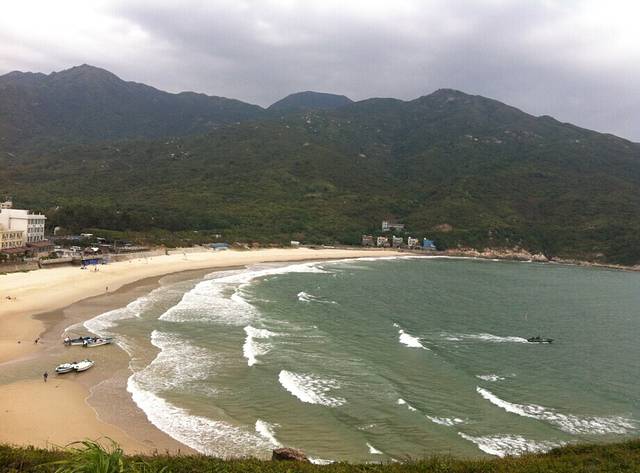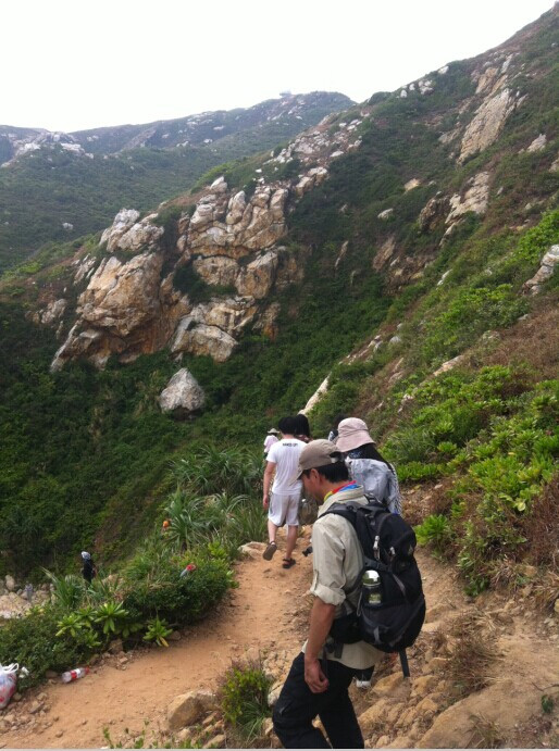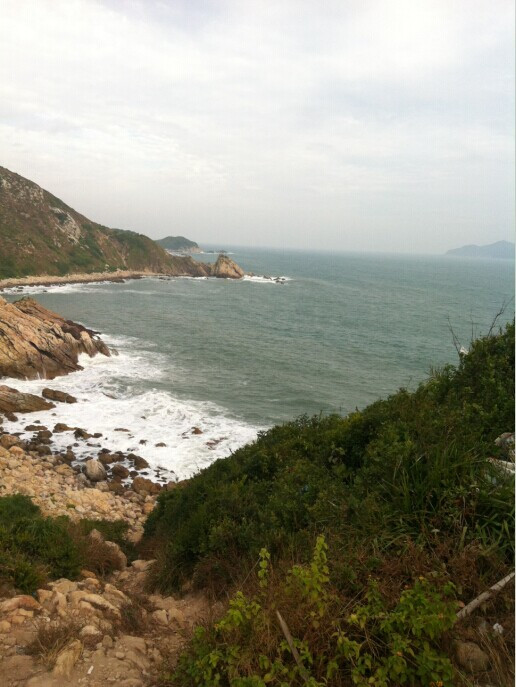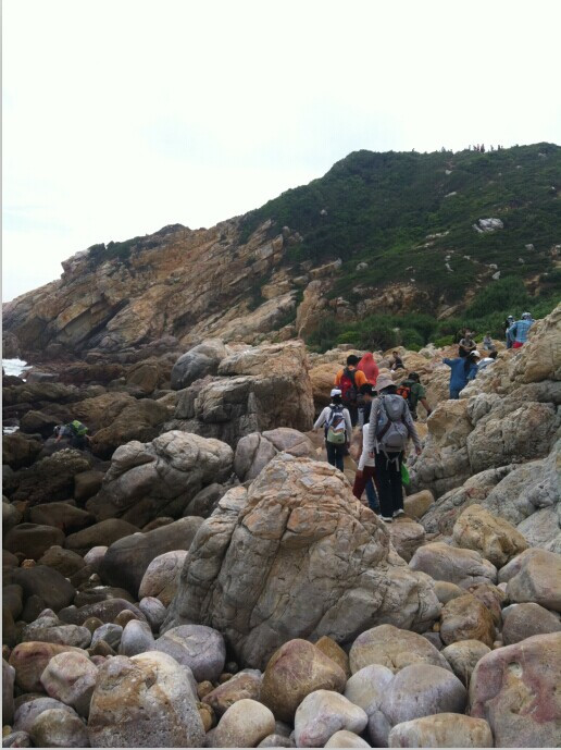 这天天气不错,因为前一天晚上刚下过雨,所以天气很适合户外。我和朋友一早8点半在车站集合,在体育馆坐到E11历经大概一个半小时的路程到达南澳,与其他队友集合完毕后我们包了一辆车到达东涌。到起点后首先是要翻越一座山,当时山上已经密密麻麻几百人,我们领队带着我们走了另外一条山路,之前对穿越海岸线的概念就是沿着海边走,但是当真的开始穿越后才发现这山路都是要沿着前人走出的土坑往上爬的,路很窄,山也比较陡,刚开始还真的有点后悔参加这次活动了。不过当到达山顶看到那么美的景色时,觉得真的来值了。这就是爬上第一座山之后拍到的东涌沙滩。