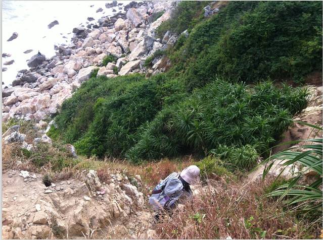 我们在高低不平的礁石上跳跃着前行了一段,还途径过徒手攀岩峭壁,又开始爬第二段山路,下山比起上山就更具挑战,因为下山的路是因为人走多了而形成的路,加上山坡比较陡,必须很好的掌握平衡并且踏实的迈每一步
