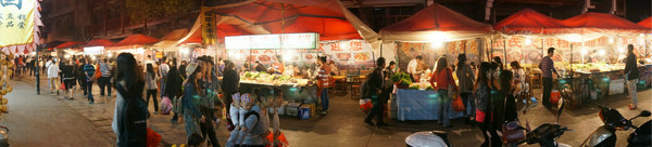 由于前一晚一直瞄着俊子饭店的几个招牌菜,不小心错过了壮观的虹桥夜市,于是痛下决心,第二天准备好肚子一直等着夜市开张。虽然夜市上每家东西都差不多,但是味道不同,各有特色,价格也小有差异,如果忍的了,亲可以货比三家再吃,反正小鱼是忍不了了,饿的眼冒金星来的,吃了五家,小鱼认为最好吃的是在一个女孩卖醪糟汤圆旁边的那一家。推荐:社饭,煎饺子,螺丝肉串,螺丝一定要吃呀,为什么湖南的螺丝就那么好吃呢,无论是爆炒,烧烤还是神马……