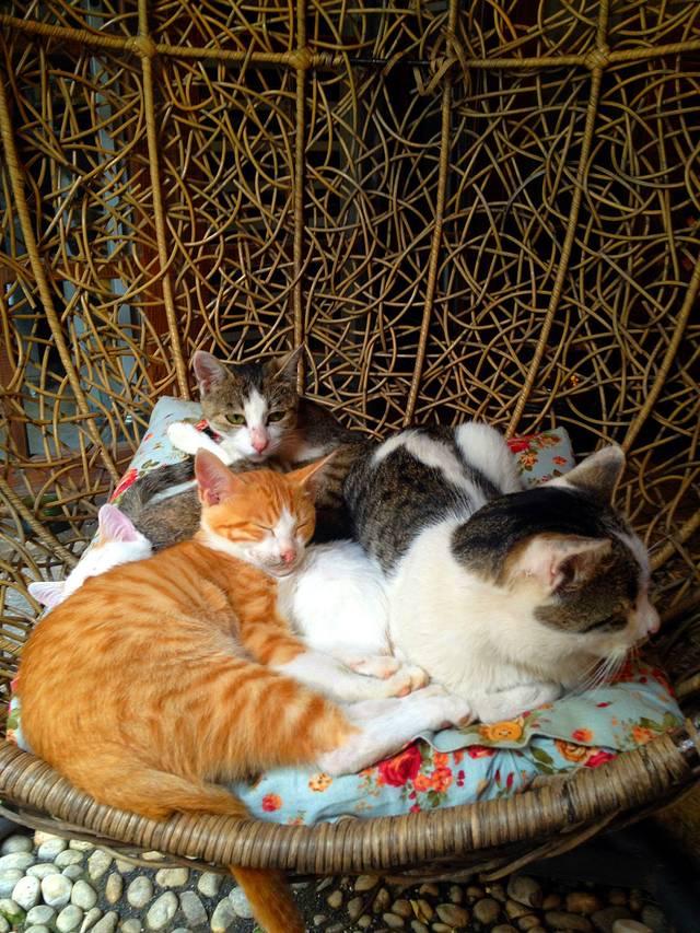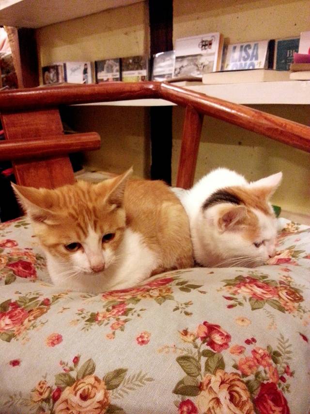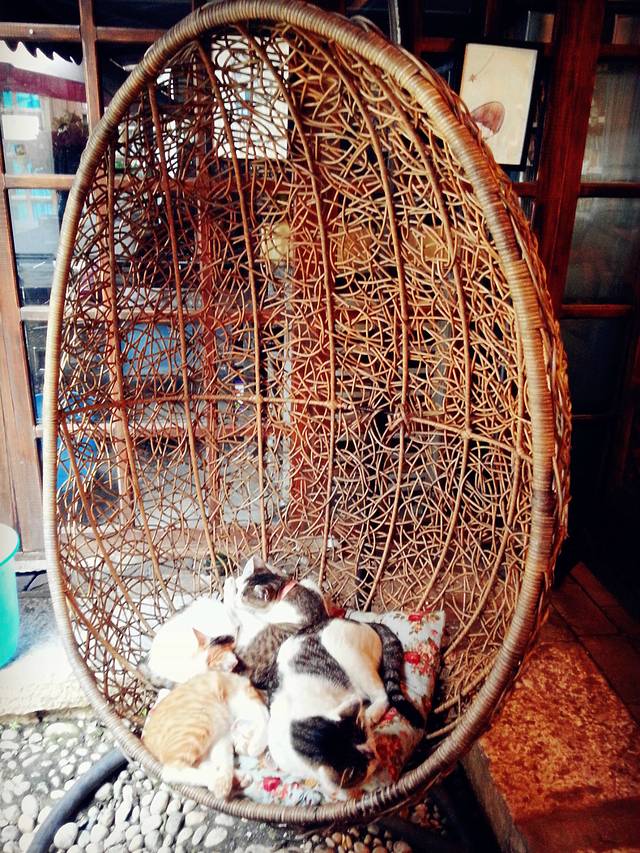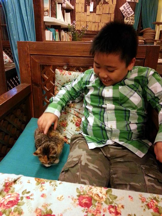 晚上路过这里,儿子说口渴,看门口挺别致,就进去了。店里有五只猫一头狗,这里的猫不怕人,很主人范,椅子随便坐,管你有没有人。