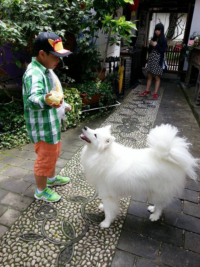 客栈环境挺好的,院子里有果树、秋千、茶几,因为是第一次住客栈,感觉还是蛮新鲜的,最令儿女喜欢的是萨摩狗张小宝,实在太可爱了,其实选这里大部分原因是因为它。这里位置不错,离商业街很近,晚上也比较清静。