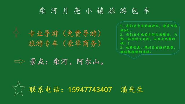 给大家介绍一位很好的导游吧,通过朋友介绍找到了导游潘先生,在去柴河的大巴上给他打的电话,然后到车站接的我们,服务态度非常好,很热情,让我觉得身在他乡却没有陌生的感觉。而且我们包潘先生的车是免费导游的。