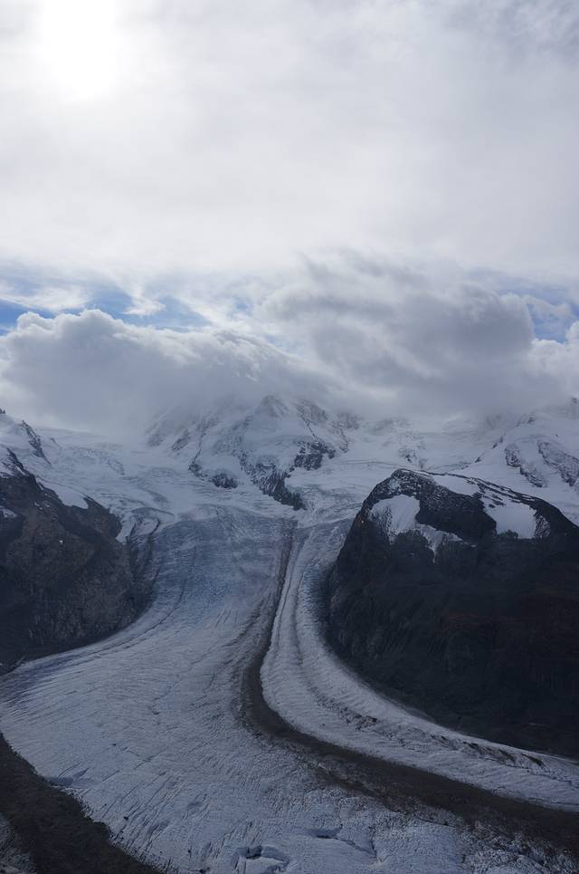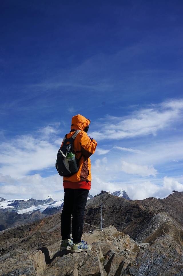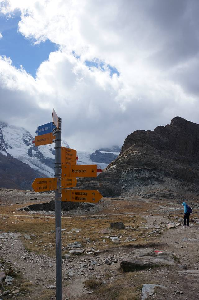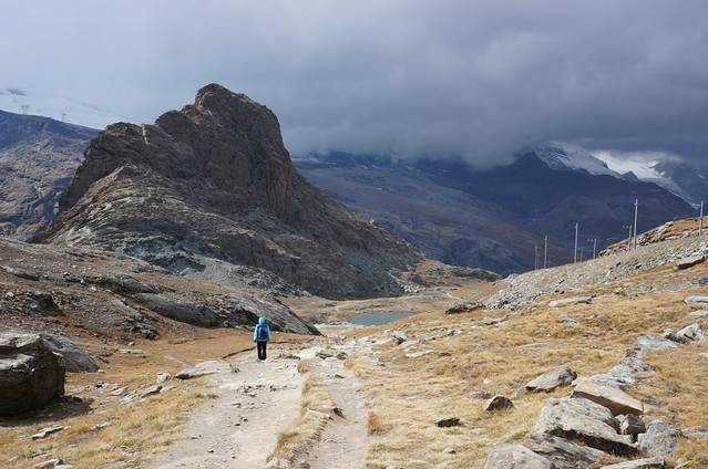 不知不觉中,已经13点,我们在山顶停留了2个小时。为了在Riffelsee湖拍摄马特宏峰美丽的倒影,我们开始了瑞士境内的第二次徒步。由于高海拔的缘故,下山的脚步并不轻松。风大、天寒、高反,我们不得不经常驻足。