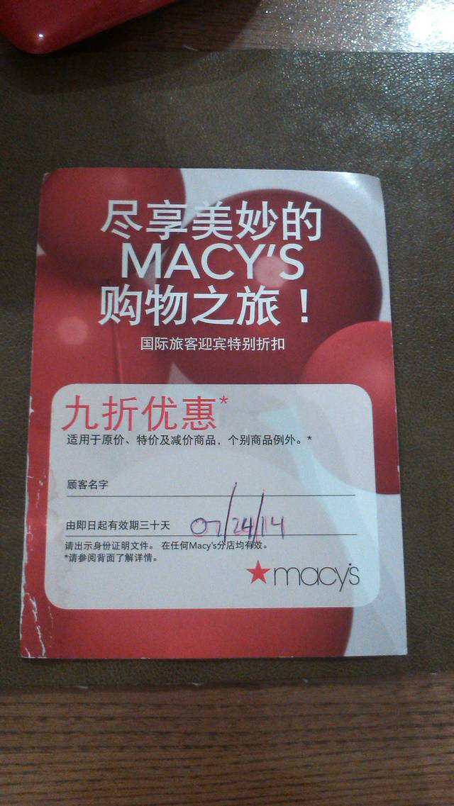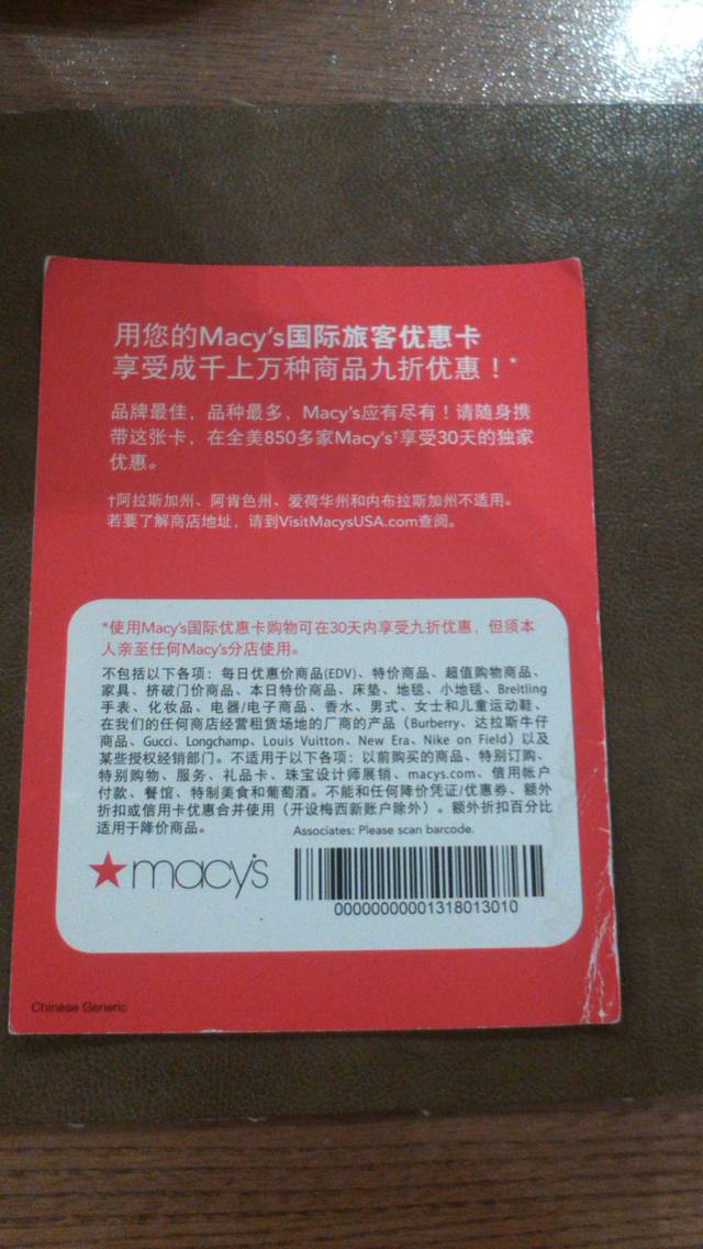 在Macy's购物可以先去一楼服务台领取一张9折卡,还是中文的哦!有效期30天。