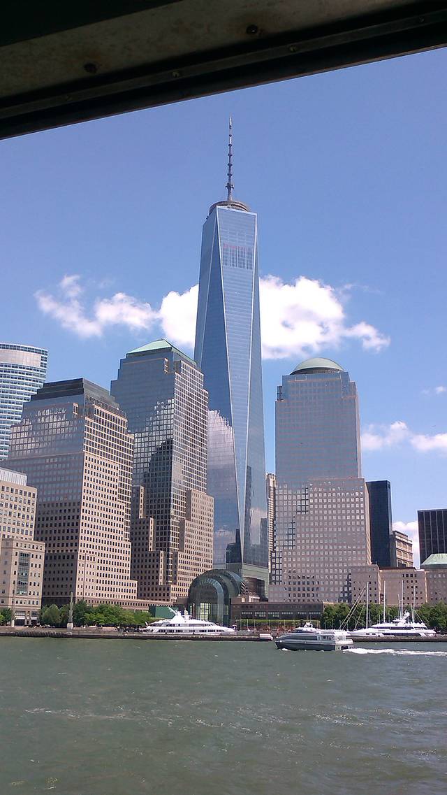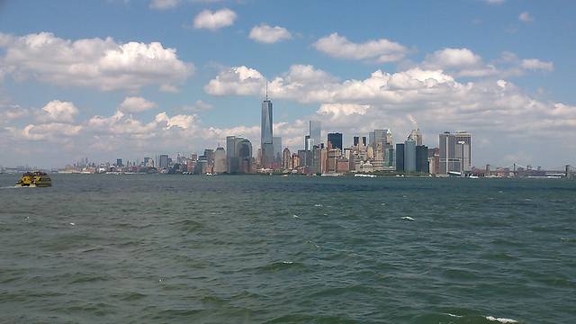 1点半我们开始环游自由女神像和曼哈顿景色了,沿哈德逊河一路驶去,回头可欣赏到曼哈顿全景,离自由女神越来越近,一个绿巨人矗立在哈德逊河口的自由岛上,她是纽约的地标建筑,是1876年法国送给美国独立100周年的礼物。我们没有上岛参观,只是近距离到此一游,船驶向布鲁克林大桥方向,船上工作人员一直介绍着沿途景点,可惜英文不行,只能听懂几个单词。绕了一圈,1个半小时多的环游结束。