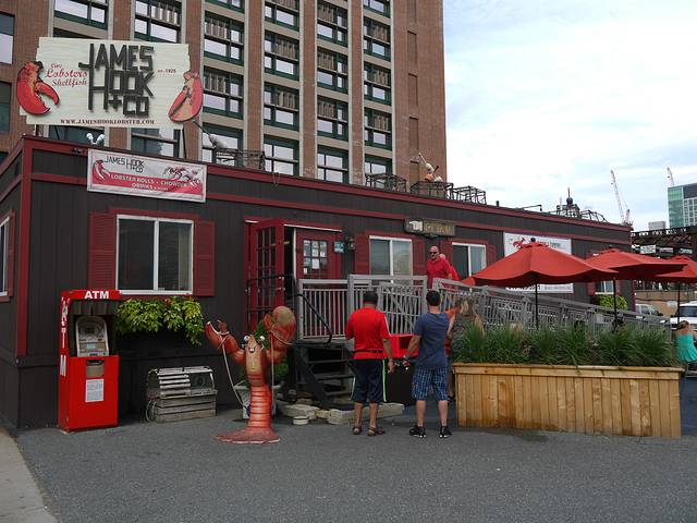 买完先找地方进行休息,和朋友一家商量明天回纽约的交通工具,最后选择坐Greyhound Line(灰狗大巴)。赶紧开始官网订票,订票显示上车前一小时取票,于是准备今天就去取票。google一下South Station,中途看到一家大龙虾店,是用集装箱做的房子,很有意思,而且排队的人络绎不绝,好!晚餐在那儿了。可回来才5点半那里已关门了,只能转场Chinatown的中餐馆了。