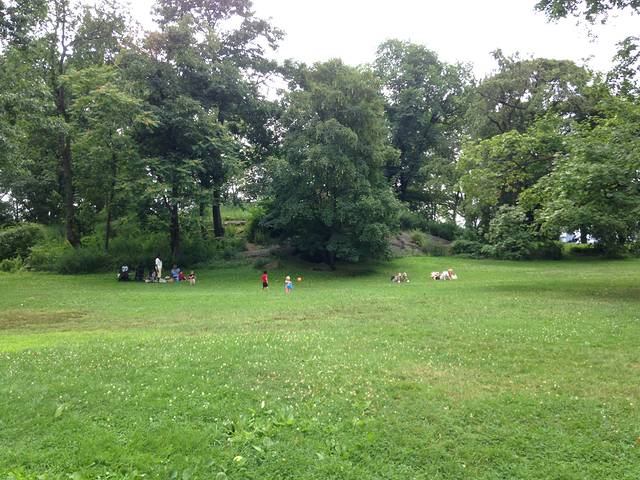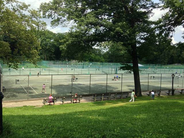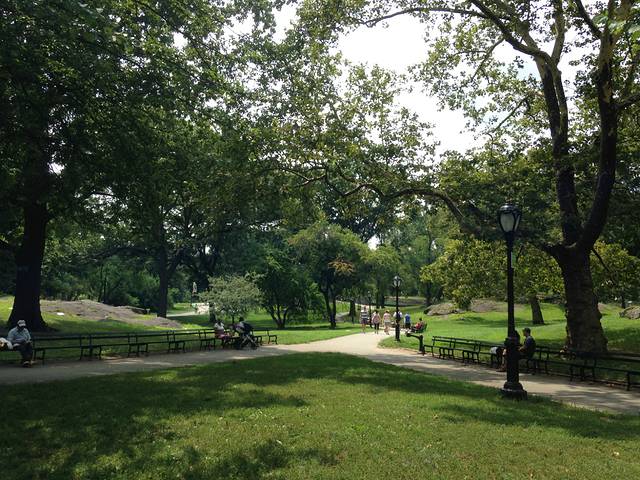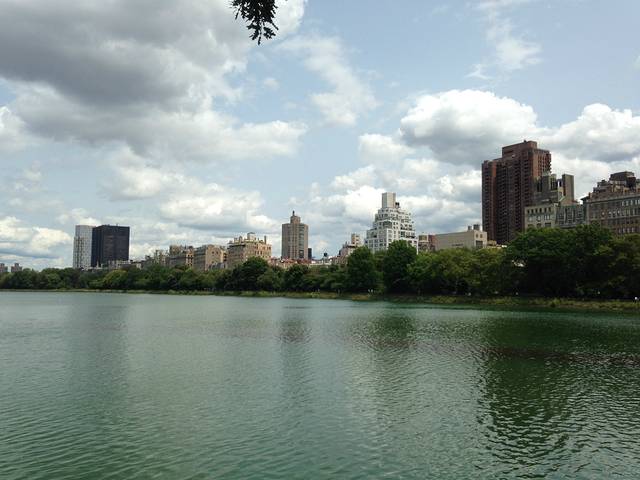 纽约给人感觉是脏——乱——差,几年前去的旧金山也是这种感觉,美国人自己也认为纽约和旧金山是最不像美国的两个城市。坐上red line发现坐错了,应该坐blue line会离中央公园更近,不过红线也到96 Street,只是会多走几个街区,就当欣赏上城区(富人区)的街景吧! 很快我们到达中央公园(Central Park),该公园号称纽约"后花园",坐落在纽约曼哈顿岛的中央,被誉为"纽约之肺",是一块完全人造的自然景观,内设有草地,小森林,庭院,溜冰场,小动物园,网球场等。这个公园很大,绿化面积也很多,有独立的、专用的自行车道和步行道。我们在游览过程中,还看到一个很大的网球场地,每个网球场都有人在打球,往前走过桥有一个很大的lake,沿湖有不少人在跑步,在这儿能看到很多瘦美国人,富人区就是不一样呀!里面还设有好几个儿童游乐区,孩子们在其中一个玩了一会,体验下美国儿童游玩设施,公园太大,我们只走了一部分。
