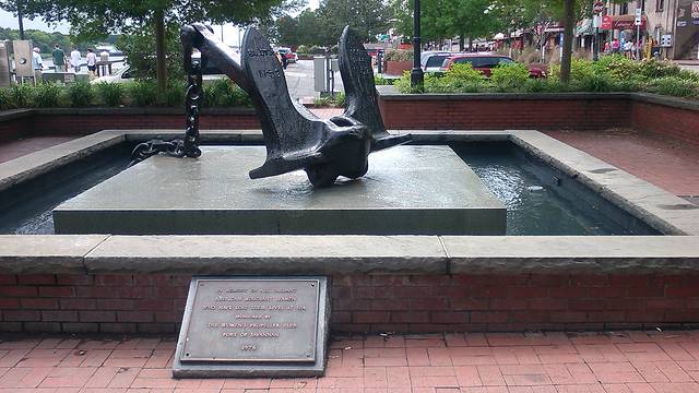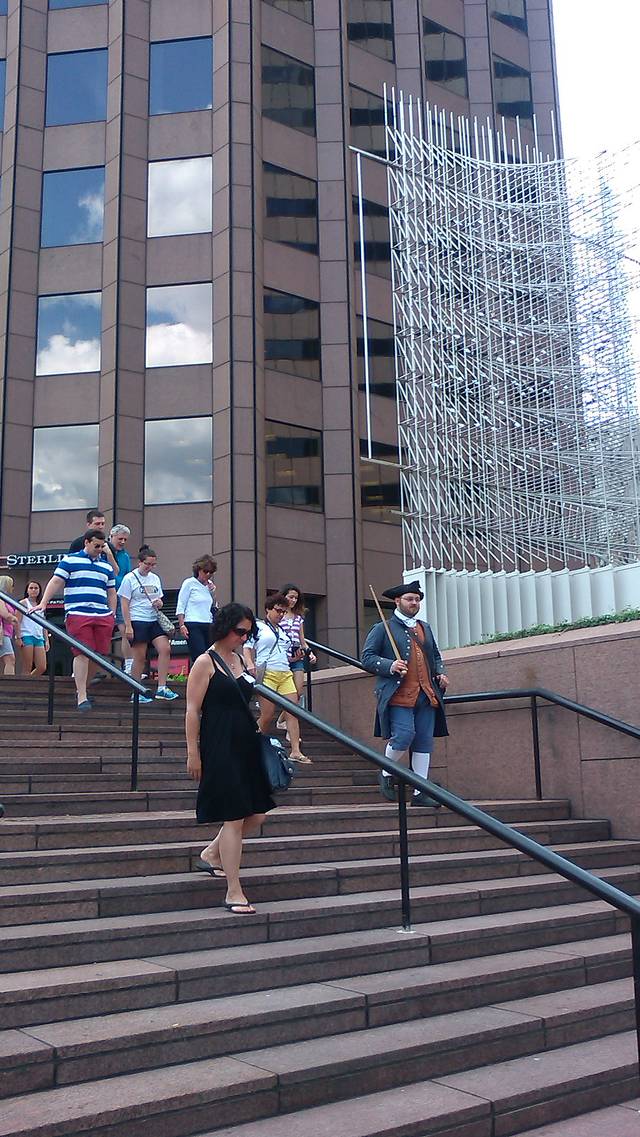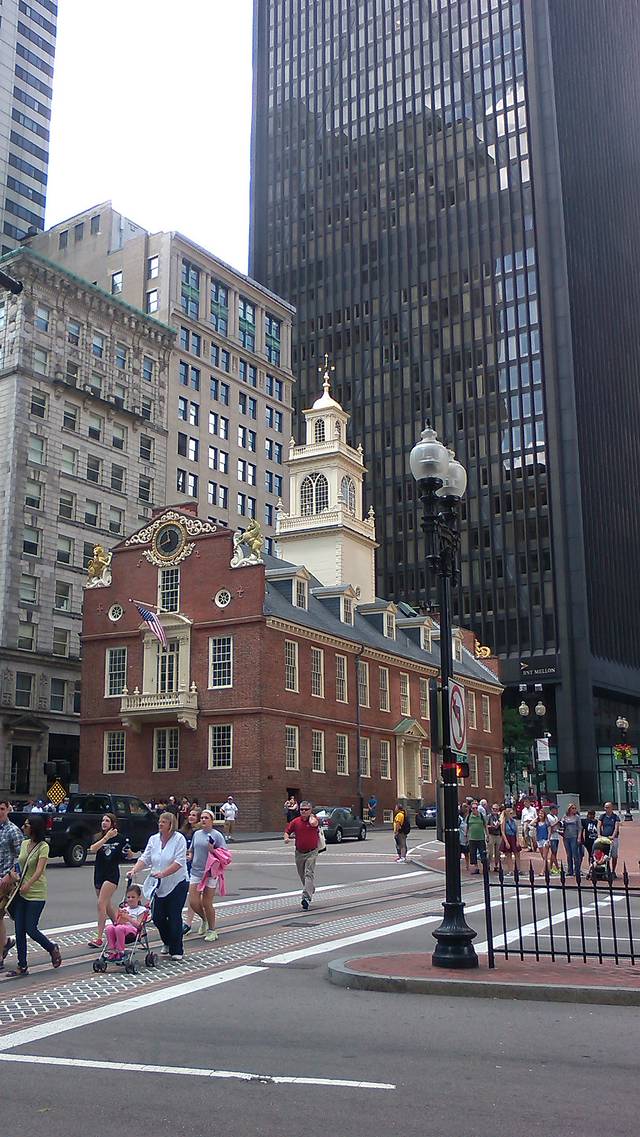 在向昆西市场前行中,发现一条用红砖在地面铺成的小路,那就是自由之路,这是现市政当局为游人设计的一条观光路线,它的起点是Boston Common(波士顿公园),终点在邦克山纪念碑,全长4公里,串联了市中心16处重要的历史古迹。离我们酒店最近的是老州议会大厦(Old State House),是现今波士顿的历史博物馆,这座建于1713年的建筑便是首次宣读《独立宣言》的地方,也是自由之路上最悠久的公共建筑物。