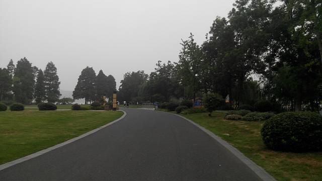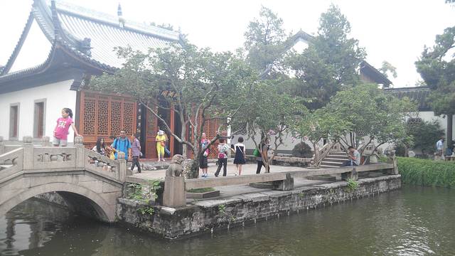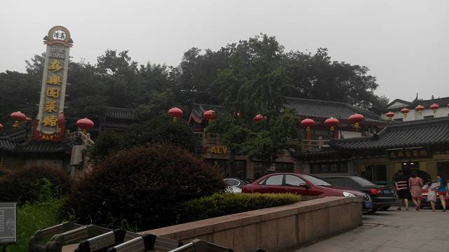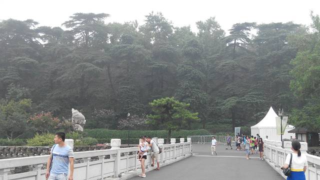 薄雾朦胧,丝毫不能影响游人的兴致。绿树蓝瓦,觉得色彩如此搭配确实给人以凝重之感。