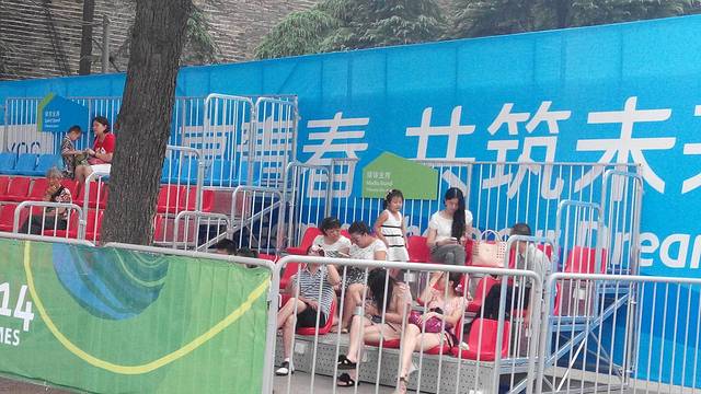 明日青奥会热身赛的看台成了游人休憩的好场所。