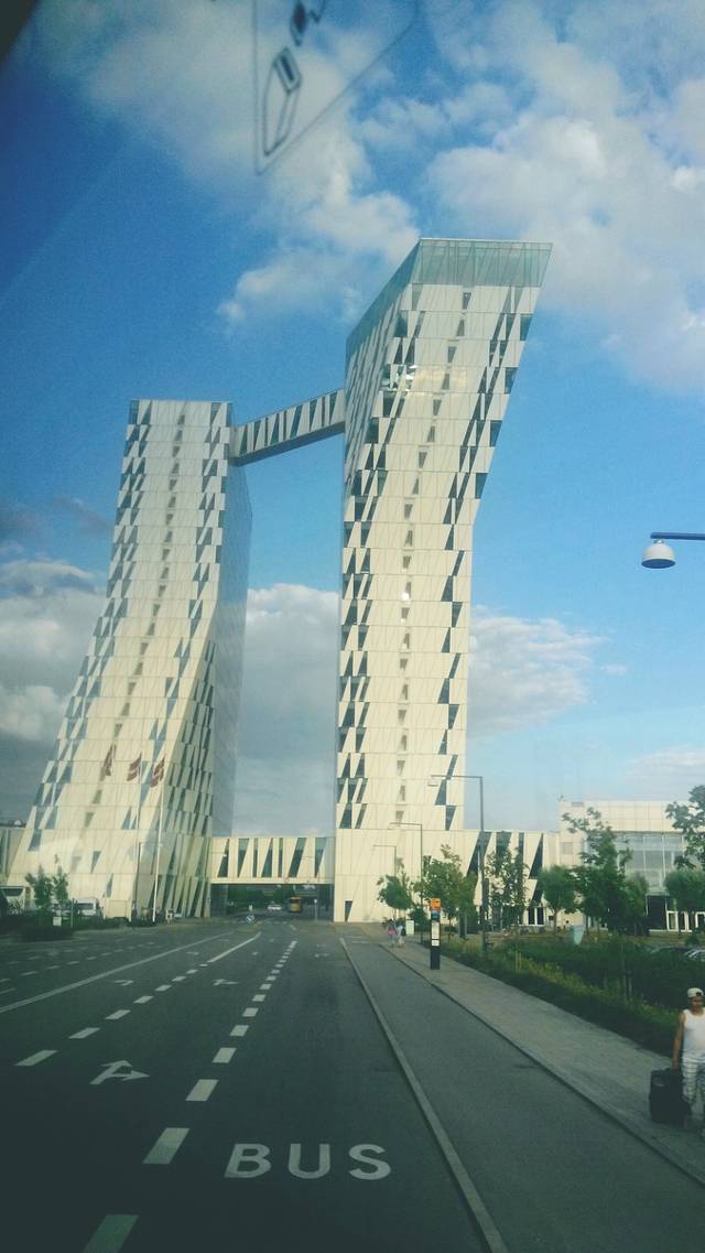 入住Bella Sky酒店,离机场很近,十分钟的车程,我叫它“丹麦大裤衩”。酒店很好,就是离市区远,交通不便,到超市要做两站地的车。酒店里有一个小餐厅,但东西奇贵,只有几个老外在吃……