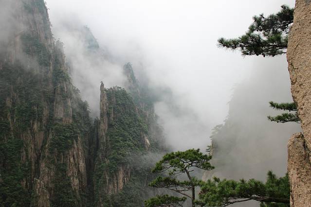 车程约2个小时,2点多到黄山景区南大门(汤口),找到网上订的酒店,看看时间还早,在网上订了翡翠谷的门票,那儿离住处约9公里路程,进去走走,看看《卧虎藏龙》的拍摄地,走走情人桥,欣赏青山如黛水如玉,老公说这种自然景观更吸引人。一个多小时走出来,回酒店吃晚饭,听老板讲讲两天的行程路线,决定明天晚上住山下,后天二次进山(要在买票时注明,否则不能进)(因为明天是周五,山上的住宿又贵条件还不好,不如住山下,还省去带行李的麻烦,轻松游玩)