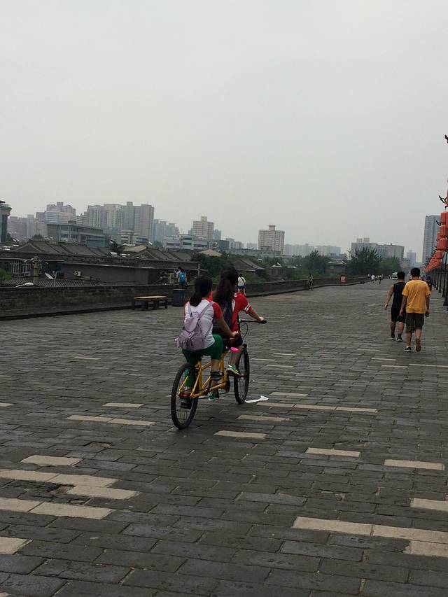 逛完钟鼓楼,我们步行到了城墙,城墙有很多口子,选择离自己最近的上吧~看完表演租了自行车,坚持骑完了一整圈,租车是2个小时内(查了一下网上别人说是100min内,我弟去租的我记不得了=。=)单人20rmb双人40rmb,并不贵,但穷游的学生娃娃切记,租车要给押金哦,我们租了一单一双,给了500.