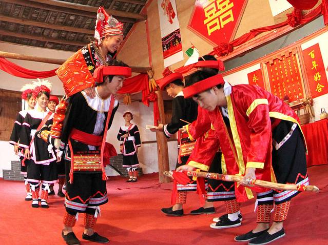 辗转便来到了瑶族婚礼表演场,相信每个女生都曾经期待过自己以后穿得像个公主一样漂亮的婚纱吧。在瑶寨这里,有着他们自己独特的风俗。“咬手定情”就是瑶族恋人之间的一种恋爱方式,恋爱双方通过对唱山歌等方式确定恋情关系,同时为表示对爱情的忠贞不渝,男方会用口在女方右手腕上使劲咬一口,来表示非她不娶,而女方接受了则表示非他不嫁。非常有意思。