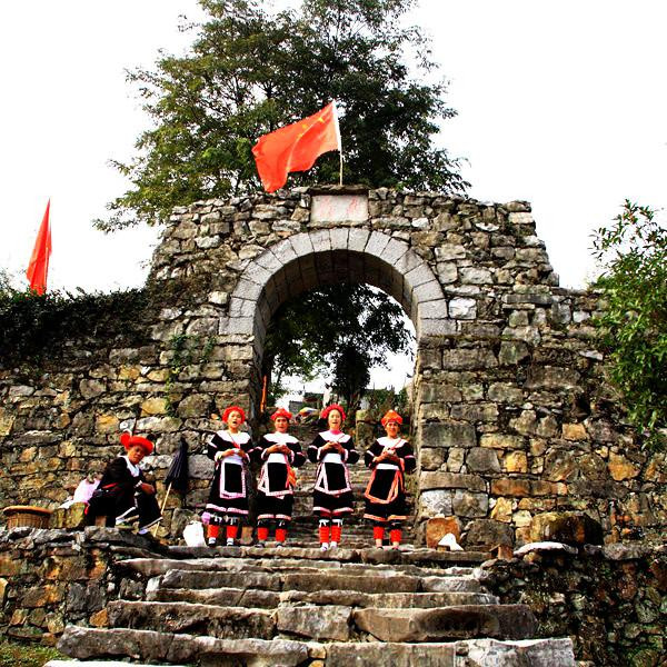 我们车里一行人走到瑶寨门口,瑶族同胞的热情让我们心里感到很温暖。他们端着瑶族人特酿的迎宾酒站在寨门口前,据说要喝下这拦门酒,以表示尊重瑶族同胞的热情。端给我酒的是一个瑶族的女孩,年龄在二十五六岁左右吧,长得白白净净,看来我那同学没骗我呀。我说我不会喝酒,她笑着举起碗,示意喝一点即可。盛情难却,喝完酒罢,我迫不及待走了进去。