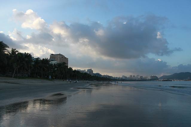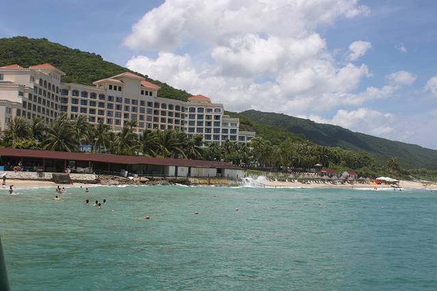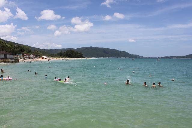三亚湾,水质一般,岸上就是椰梦长廊,住宿有喜来登,就在月川广场后边。最近三亚湾补沙子,虽然白天不施工,但水质也较差。