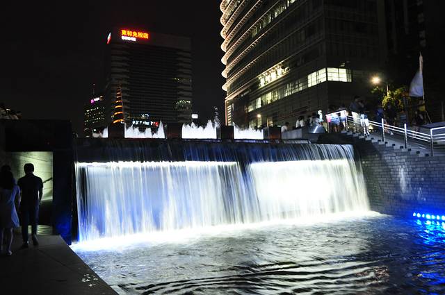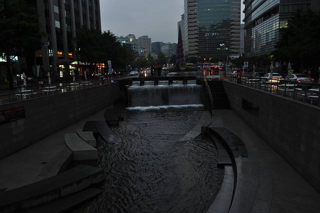 因为第二天的时候没下到清溪川边, 为了不让自己带有遗憾, 我们再次来到这里. 沿着市政大楼左边的马路走, 就能走到清溪川广场. 开放了的清溪川跟之前看到的完全不一样, 整个让我兴奋起来.