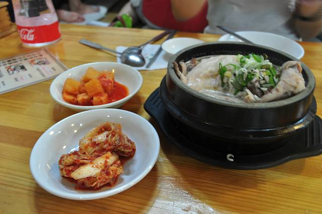土俗村参鸡汤也是到韩国必试的店. 很多人冒名而来, 而且不止旅客多, 本地人也很多. 听旅馆的老板说, 这里只要超过11点就要大排长龙. 我们11点45分到, 已经看不到队尾了, 而且当天还下雨. 很多人都撑着伞在排队. 幸好, 店里的可以流动得很快, 长长的队伍, 我们也就拍了20分钟左右. 这店也很好找. 坐3号线到达景福宫站, 从2号出口, 往前走大概3分钟左右, 看到一个有便利店gs25的路口, 往左拐就能看到大大的招牌还有长长的人龙. 店内的餐牌没有中文, 只有部分有图片, 不过店员有很多会中文, 所以点餐没有问题.