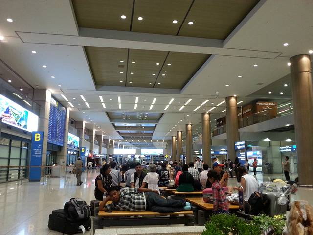 韩国的机场很人性化, 也可能是他们的风俗就比较喜欢没有限定的座位. 都是这样一排一排的大板凳(有点像韩剧中的凉床), 给了在机场滞留的旅客睡觉休息的方便. 在这里看到各种人种, 各种姿态, 真心觉得无国界.OH, 还有就是在机场里面挂了一个很大很大的exo海报, 应该是韩粉的挚爱吧.