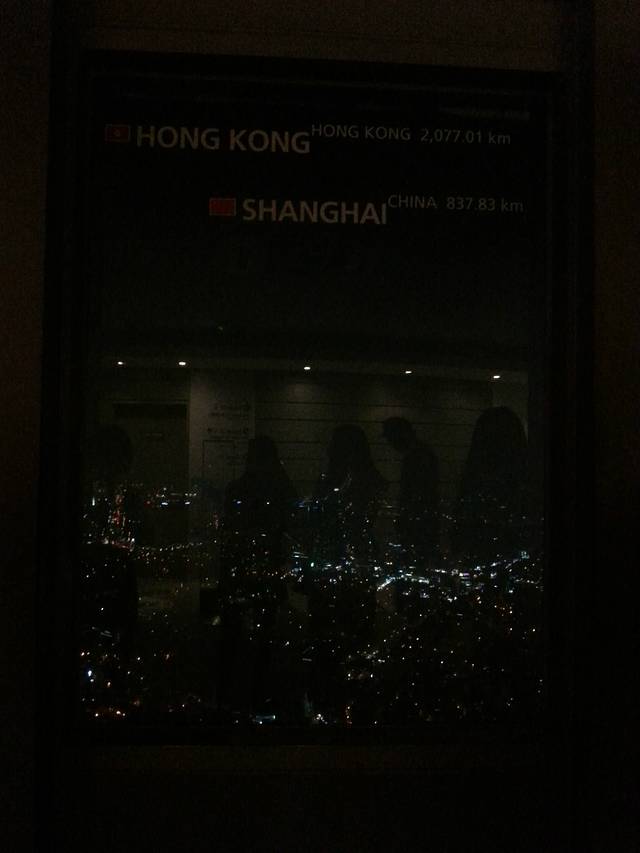 塔上, 每一块观景玻璃上都会标注与所在方向一致的城市. 站在这个位置上, 距离837.83km 就是上海, 2077.01km就是香港. 站在这里, 不免想起这时候的家人在干嘛, 所谓的浪漫情怀就是这样来的吧.