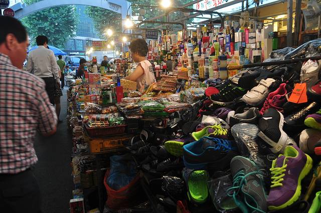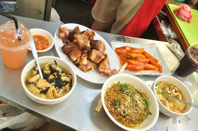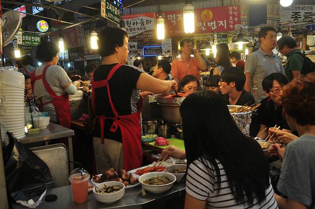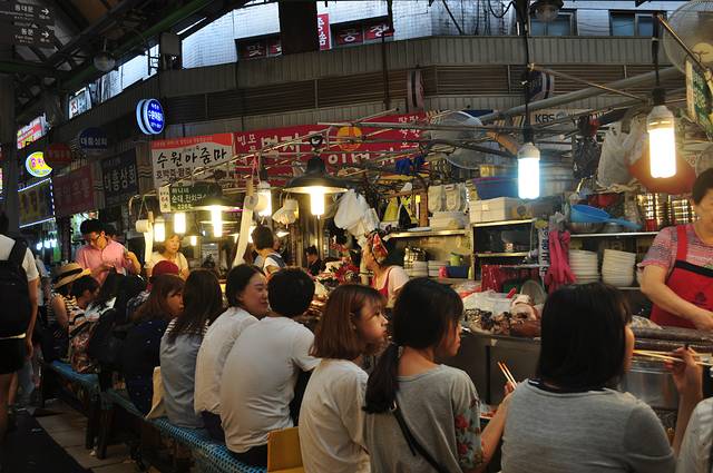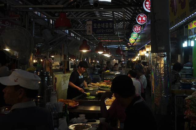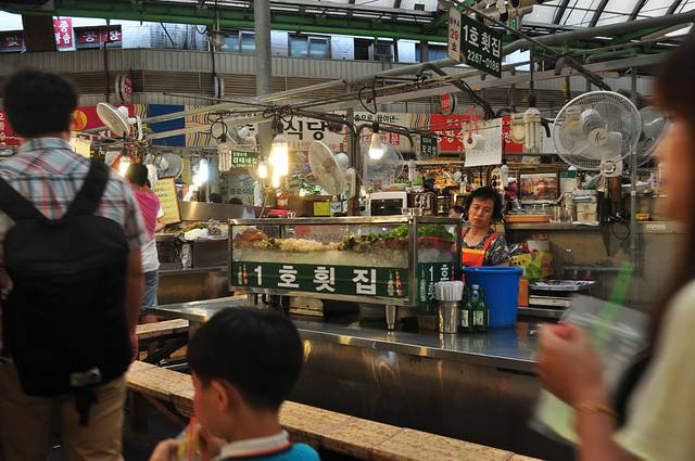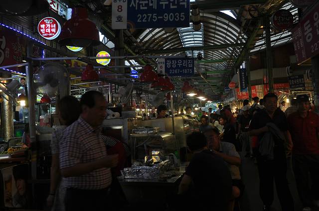 玩了一天也累了, 我们决定去韩国的市场, 吃吃最地道的韩国小食. 广藏市场是1号线到钟路5街站8号出口, 往前走大概100米左右就到了. 市场里饮食类分了几大区域, 煎饼区、海鲜刺身区、鱼糕年糕区等等.